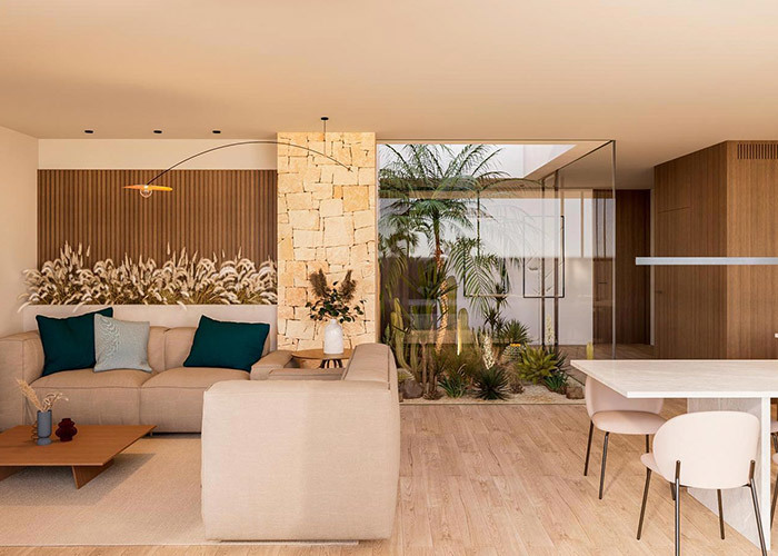 27x26미터의 넓은 부지에 자리한 수바 하우스는 약 347제곱미터의 내부 생활 공간을 제공합니다. H자 모양의 레이아웃은 중앙 척추에서 뻗어 나가는 네 개의 뚜렷한 날개를 생성하며, 이 볼륨 사이의 빈 공간은 보호된 야외 공간을 형성합니다. 집의 중심에 위치한 중앙 안뜰은 수영장을 위한 기회를 제공하여 여러 실내 공간에서 볼 수 있는 초점을 만듭니다.